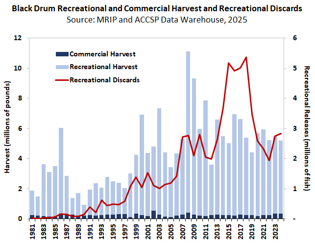 With sizes reaching over 46 inches in length and 120 pounds in weight, black drum are drawing increasing interest from recreational anglers, particularly as a catch and release fishery. Outside of a large peak in 2008, recreational and commercial landings have remained fairly stable since 2000, with recreational landings far exceeding (typically 20-30 times) those of commercial (by weight).