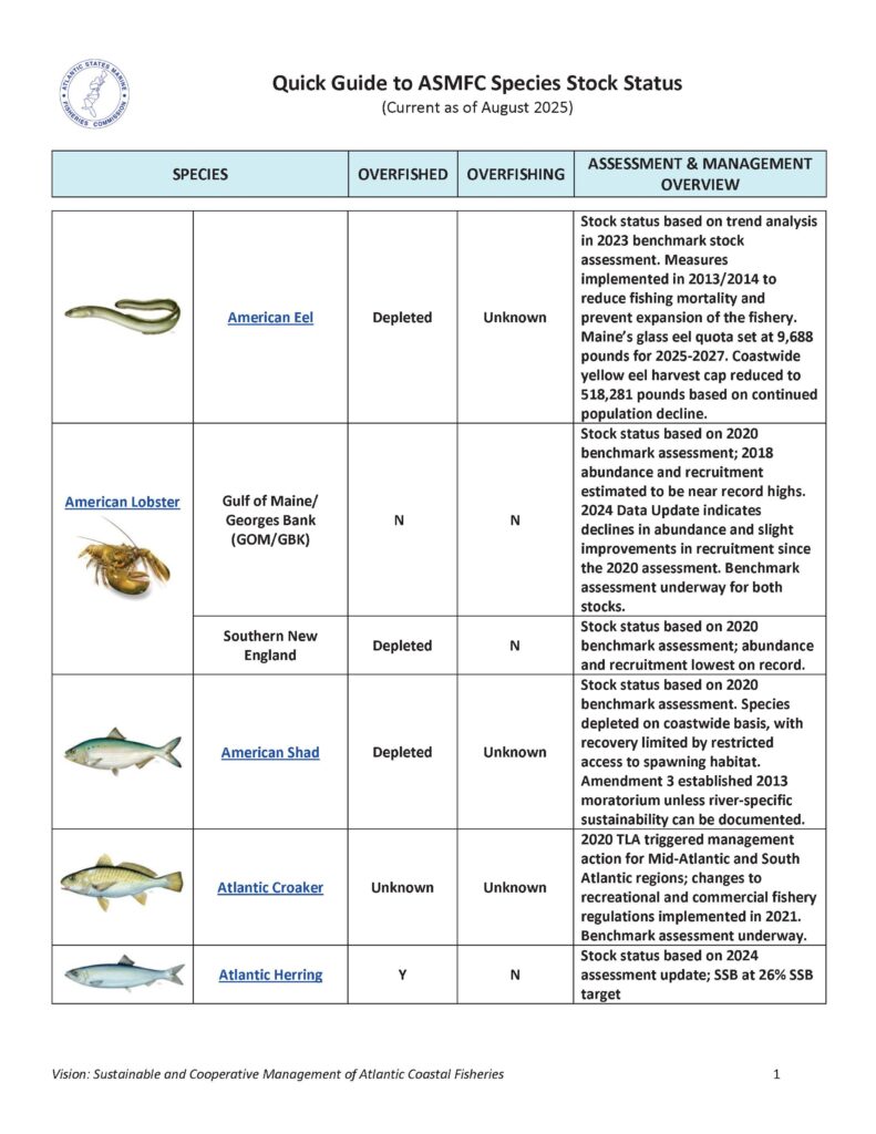 Stock status based on trend analysis in 2023 benchmark stock assessment. Coastwide yellow eel harvest cap reduced to 518,281 pounds based on assessment and continued population decline. Maineโs glass eel quota set at 9,688 pounds for 2025-2027.