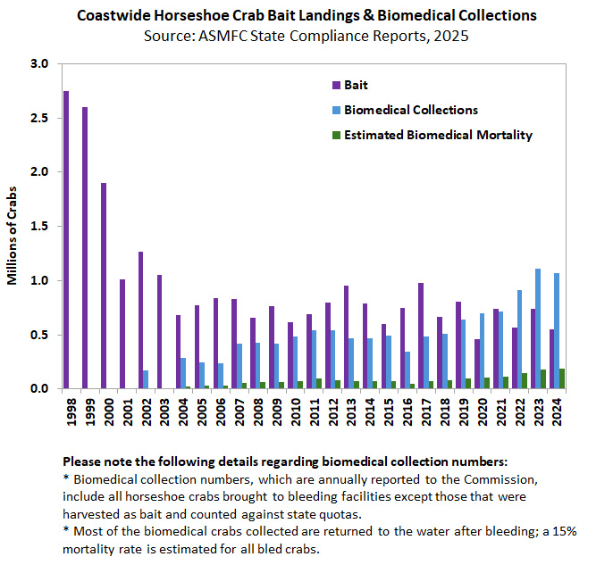 Horseshoe crabs are also collected by the biomedical industry to support the production of LAL, a clotting agent that aids in the detection of human pathogens in patients, drugs, and intravenous devices. Blood from the horseshoe crab is obtained by collecting adults and extracting a portion of their blood. Most crabs collected and bled by the biomedical industry are, as required by the FMP, released alive to the water from where they were collected; however, a portion of these crabs die from the procedure. Crabs harvested for bait are sometimes bled prior to being processed and sold by the bait industry; these crabs are counted against the bait quota. Biomedical use has increased since 2004, when reporting began. In 2024, 1,073,329 horseshoe crabs were collected coastwide solely for biomedical purposes, and the total estimated biomedical mortality was 184,693 horseshoe crabs. Biomedical data were included as part of the 2019 benchmark stock assessment and 2024 update and continue to be provided to the Commission annually through state compliance reports, although the data remain confidential to the public at a regional or state level.